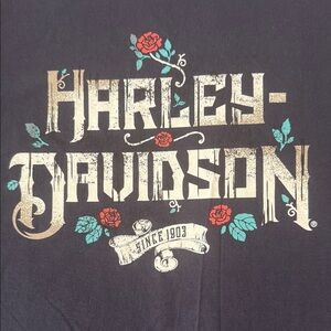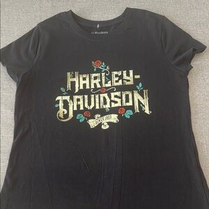 Stylish black tee featuring Harley-Davidson logo. Gold lettering with red accents.NWOT