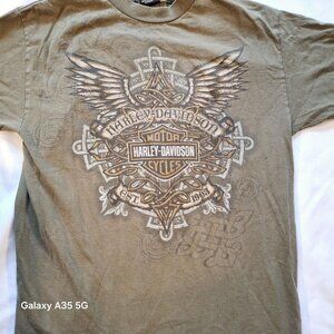 Stylish olive tee with Harley-Davidson logo. Features intricate winged design. Comfortable short sleeves.