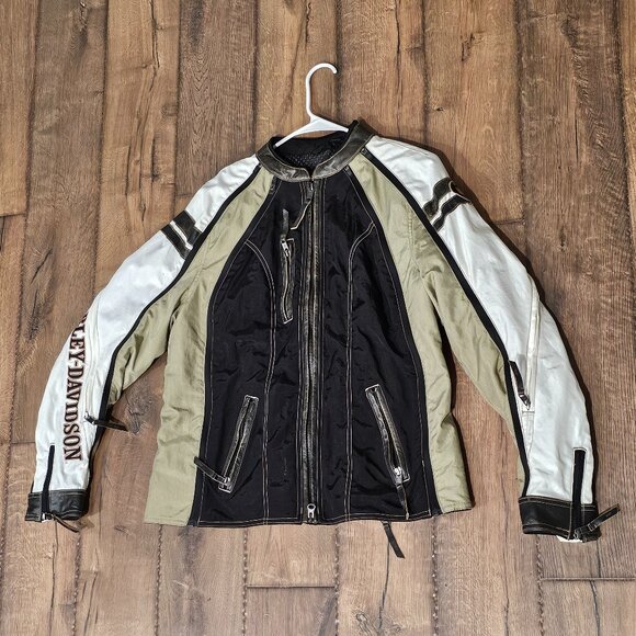 Gently used Harley-Davidson Pacer Switchback Jacket Women's 1W. Tan, black, and white riding jacket. Good for cooler weather. No rips or tears. Great shape.