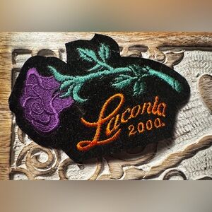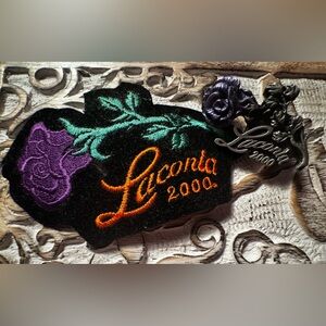 Harley-Davidson Laconia Patch & Pin. Embroidered patch commemorating Laconia Motorcycle week from year 2000 featuring a purple rose. Pin is also featuring a purple rose from Laconia 2000 back is signed, I can’t make out the signature. Great condition. Some wear to the back as expected with age.