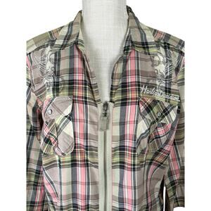 Harley-Davidson Plaid Half Sleeve Zip Up Shirt Women's XL Embroidered Logos Tan