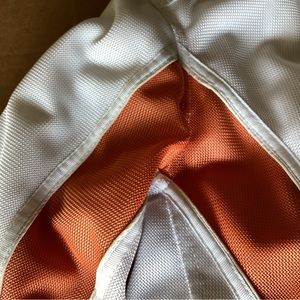 Orange and white mesh jacket. Perforated to let the air flow through and through.