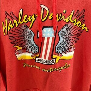 Embrace the spirit of adventure with this Harley-Davidson red sweatshirt, featuring a striking wing graphic design on the front. Crafted for comfort and style, this sweatshirt is perfect for showcasing your passion for the iconic brand. Ideal for casual outings, it combines a relaxed fit with a bold aesthetic.