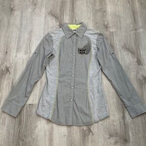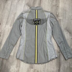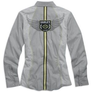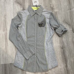 Harley-Davidson Ribbon Detail Knit and Woven Stripe Long Sleeve Shirt in size XS. New with tags! No flaws. 72% cotton, 25% nylon, 3% spandex. Crinkle effect. Pearlized snap front and cuffs. Jersey side panels with contrasting stitching. Convertible roll-up sleeves with pearlized snap tabs. Ribbon detail down back. Embroidered patch and embroidered graphics on left chest. Embroidered patch and embroidered graphics on back. Fantastic colors!