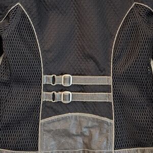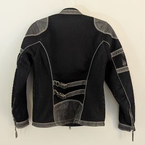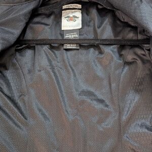 Harley-Davidson Revelator Riding Jacket with leather trim in good used condition. Leather trim has a worn patina. Please see last pic for some pulling to mesh front. Not very obvious, but is there. 18" across chest and 23" length. Non-smoking home.