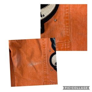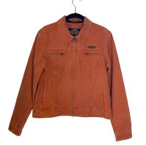 Features double front zipper closure, expandable zip cuffs, snap collar, 2 zip breast & side pockets, 2 interior pockets & a Live to Ride Ride to Live Harley patch on the back.