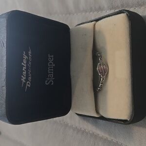 Stylish ring with Harley-Davidson logo. Silver band with pink accent.