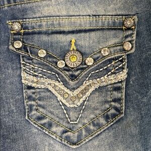 Rhinestone accented button and rivets and back flap pockets with signature Harley-Davidson® embroidery and rhinestone embellishment