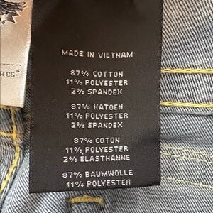 Made of 87% cotton, 11% polyester and 2% spandex 10.4 oz. denim