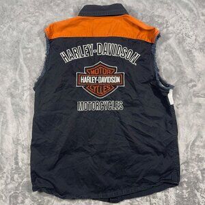 Harley-Davidson Sleeveless Button-Up Shirt Mens L Black Orange White Distressed
