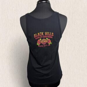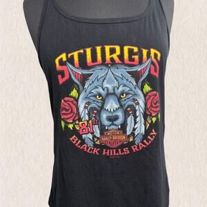 Harley-Davidson Sturgis Black Hills Rally women’s tank top, size Medium. Classic black cotton racerback tank with bold wolf and rose graphic on the front and Black Hills Harley-Davidson Rapid City, SD graphic on the back. Features the 81st Sturgis Rally (2021) design.