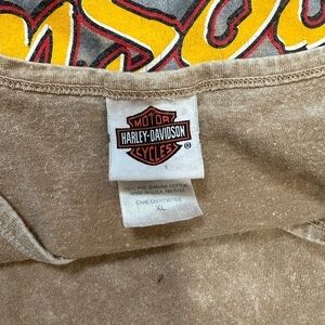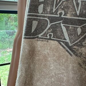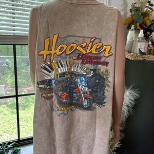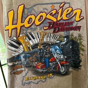 2006. Hoosier Harley representing Elkhart, IN. One minimal hole from distressing. Can be used for a dress on a small-med person (w/ a flannel for idea).