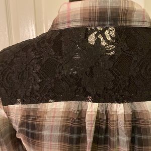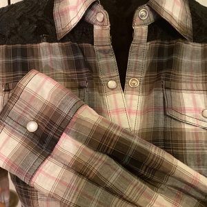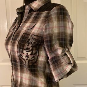Ladies Harley-Davidson button up top. Super cute top with Pearl snaps, 2 front pockets, embroidered graphics, adjustable sleeves and see through lace at shoulders. It would look better ironed but my iron is on the fritz sorry! Length 25 inches 17 1/2 pit to pit