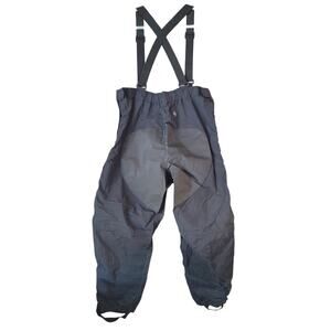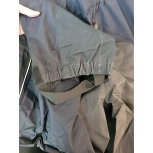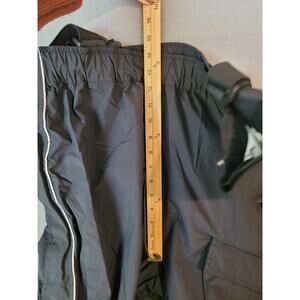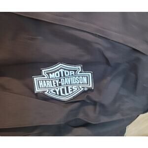 Durable Harley-Davidson motorcycle overalls/bibs in black 100% nylon. Designed for riders with practical features including a high-rise waist, full-length inseam, and reflective logo patch on the leg for added visibility. Perfect for weather protection and riding comfort. Excellent preowned condition.