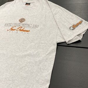 Harley-Davidson Vintage Dealer Show Jazz t-shirt from New Orleans Show in 2000. Thick, great quality, soft cotton. Small spot on front of shirt, pictured. Spot is only sign of wear and has not been treated. Image on the back features a saxophone and musician with a Harley-Davidson Motorcycle. Please refer to photos for exact size, details, and condition.