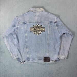 Vintage Harley-Davidson denim jacket, a true American classic. This light wash denim jacket features a button-up front, dual chest pockets, and a classic collar. Perfect for adding a touch of rugged style to your everyday look or for layering on cool evenings.