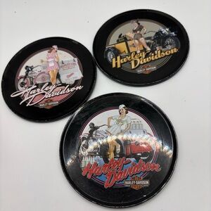 Set of three Harley-Davidson coasters. Features vintage motorcycle designs. Perfect for collectors.