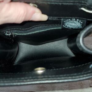 This bag is adorable! Its thick heavy leather. It snaps shut at the top. It has a small leather zippered pocket on the inside.