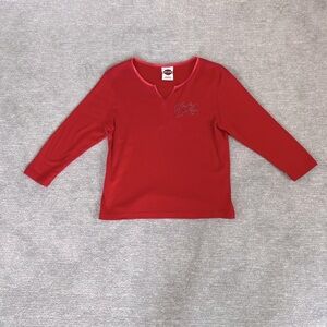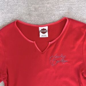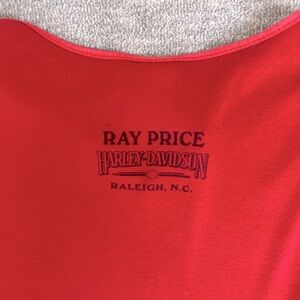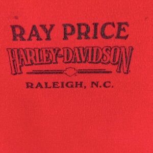 This Harley-Davidson top is vintage and made in the USA! It is 100% cotton, soft and comfortable. It has 3/4 sleeves. The Harley store is Ray Price, Raleigh NC. It is in good vintage condition. There is a small dark spot on the back near the writing, but that was there from the beginning. (See photo) Please check measurements.