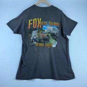 This Harley-Davidson graphic t-shirt has that perfect vintage-style fade with a well-worn look that gives it an effortlessly cool, lived-in feel. Featuring a Harley-Davidson Motorcycles logo on the front with a subtly distressed print and a bold graphic back hit from Fox Harley-Davidson in Ontario, Canada, this shirt embodies classic biker style.