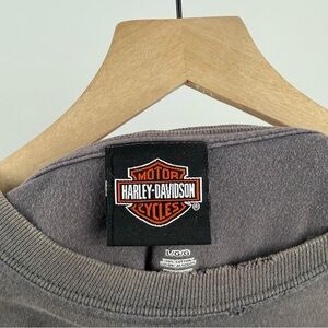 This tee has authentic wear that adds to its rugged, vintage-style charm. There’s some light distressing, a faded front graphic, and a minor mark near the bottom (see photos). No major flaws—just the kind of genuine aging that makes vintage-style Harley tees so sought after.