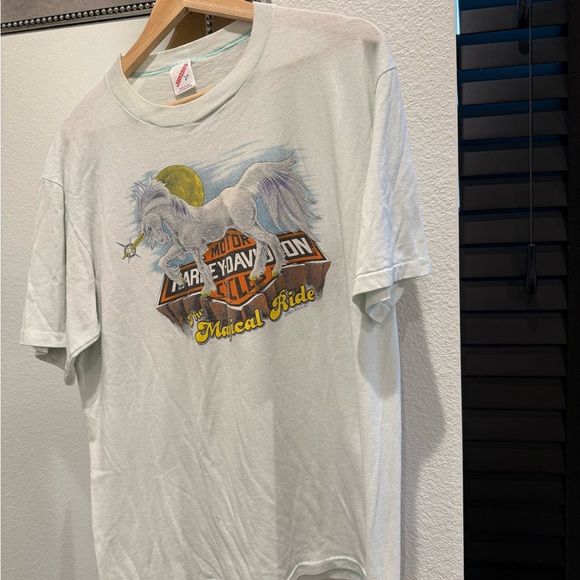 White tee with a mystical unicorn graphic. Features Harley-Davidson logo. Short sleeves for casual comfort.