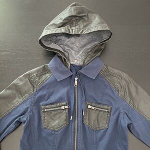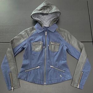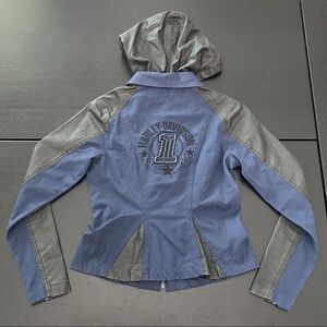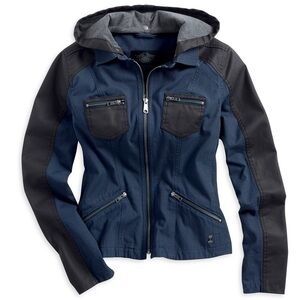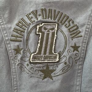 Harley-Davidson Women’s #1 Skull Canvas Biker Jacket in size XS. 100% cotton canvas. Washed for softness. Zipper front with snap-off lined hood. Zipper cuffs. Two zipper hand-warmer pockets. Two zipper chest pockets. Contrasting coated cotton canvas sleeve panels, chest pockets, back waist gussets, and hood. Metal badge on front left hem. Embroidered and embroidered raw-edge appliqué graphics on back. No flaws no signs of use.