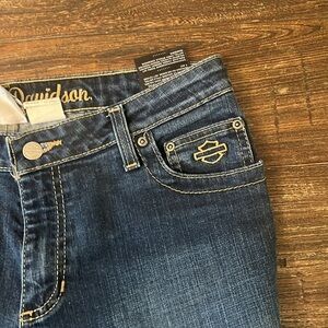 biker, moto, Harley, casual, embroidered, rhinestone, straight, raw hem, mid rise, dark wash. These jeans bring together rugged biker style and feminine sparkle, making them stand out from ordinary denim. Great for everyday wear or special Harley events, with a flattering cut that transitions easily from day to night. Harley-Davidson jeans, Harley-Davidson rhinestone jeans, Harley-Davidson women’s denim, embellished Harley jeans, Harley-Davidson blue jeans size 6, Harley-Davidson biker style jeans, rhinestone denim women. biker chic, rocker style, edgy fashion, streetwear, casual chic, concert outfit, motorcycle rally style, weekend wear, night out outfit, bold statement denim, Harley-Davidson