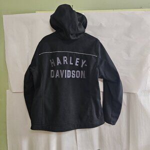 Harley-Davidson® Women's Deflector Hooded Riding Fleece Jacket - Black, 98112-23VW. Features zippered underarm venting, windproof materials, pre-curved sleeves and adjustable hood. Made from 66% polyester and 34% cotton polar fleece with a 100% polyester mesh lining. Two-way zip front. Zippered hand-warmer pockets. One interior stash pocket and one interior zippered pocket. Armor pockets at shoulders, elbows and back. Abrasion resistant. 3M Scotchlite reflective material piping at back yoke. Contrasting reflective piping. Casual styling. Direct embroidery. 98112-23VW