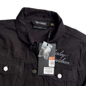 Details: Harley-Davidson embroidered logo on chest, button-up front, dual chest pockets, structured denim-style fit