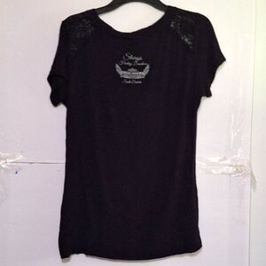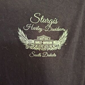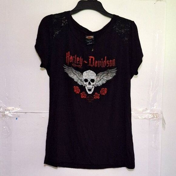 A Women's large Harley-Davidson motorcycle graphic t-shirt. This piece features the skull with wings and roses underneath. This graphic is distressed, This is a very light weight 95% rayon and 5% spandex with black lace at the shoulders. This piece came from Sturgis Harley-Davidson shop in South Dakota. This shirt is soft and made for comfort.