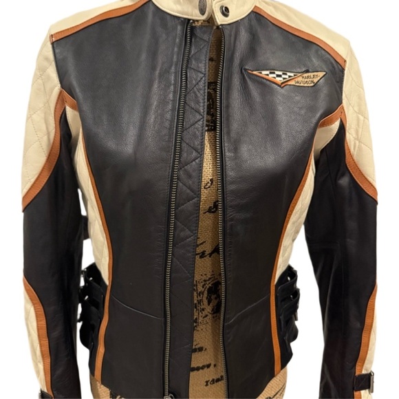 Stylish Harley-Davidson leather jacket. Black, cream, and orange design. Iconic logo on chest. Perfect for riding. New without tags
