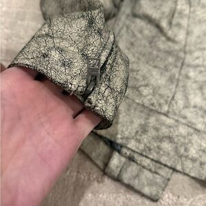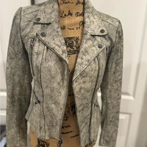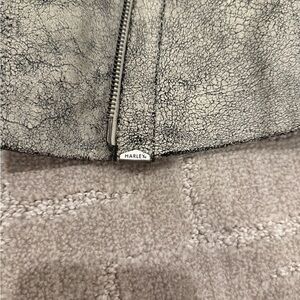 Stylish Harley-Davidson leather jacket. Distressed gray design. Features multiple zippers and snap buttons. Perfect for a bold look.