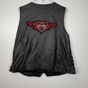 Authentic Harley-Davidson women’s leather vest in size XL. Crafted from genuine leather with a fully lined interior, side lace-up detailing, and front zip closure. This vest also comes with several collectible Harley-Davidson/HOG pins already attached, making it both functional and highly collectible.