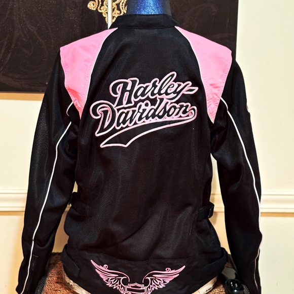 Stay stylish and comfortable with the Harley-Davidson Women's Jacket. Featuring a sleek black design with vibrant pink accents, this jacket is perfect for any occasion. Show off your love for Harley-Davidson with this eye-catching piece.