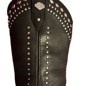 Designed with a square toe, studded front and back straps attached to a side O'Ring, studs about the top and down the sides of the shaft, and an embossed Harley-Davidson® Bar & Shield logo on the heel. Total height: 14-inches, Shaft height, 12-inches, Heel height: