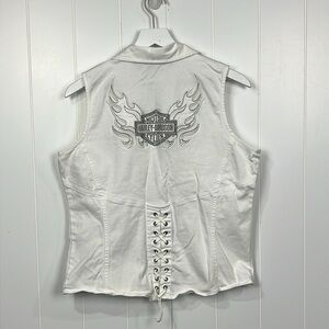 Harley-Davidson Womens Y2K Motorcycle Vest L White Zip Front Pockets Corset Back w/Bling Vintage 97% Cotton Collector Fun Versatile EUC