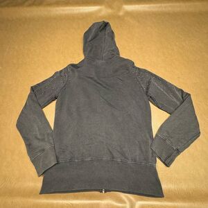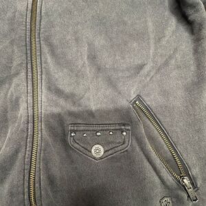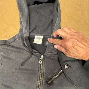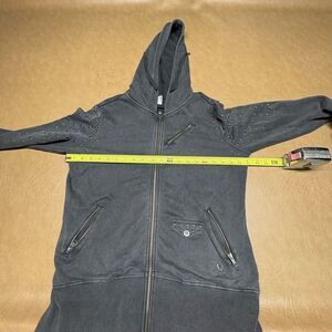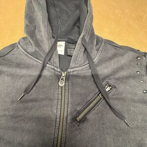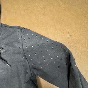 Charcoal hoodie with studded accents. Features a zip-up front and sleek design.