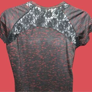 Black affliction style top with red color mixed in. Heart shaped center has tiny sparkle stones! Has lace at shoulders and in back at neck! Like new condition!!
