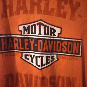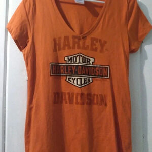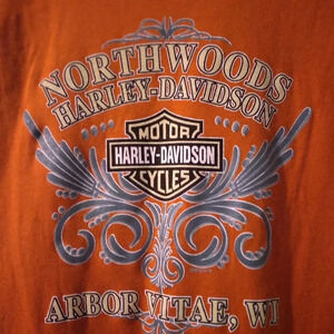Excellent condition-maybe worn once. Size large(armpit to armpit is 19 and centerback length is 26". Orange with graphics on front and back. Dealership is Northwoods in Arbor vitae, WI