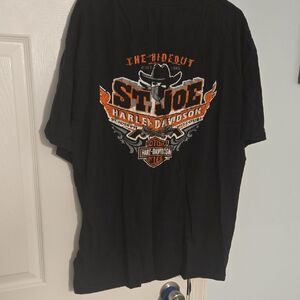 Black tee featuring Harley-Davidson logo with flame accents. Bold and stylish.