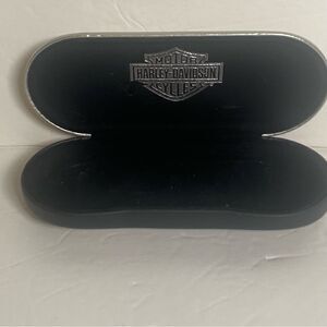 Harley-Davidson Silver and Black Hinged Hard Eyeglass Case. Good pre-owned condition. A few slight indents in silver portion and black interior. 2001 HD 522 on back case. Measures approximately 6.5" x 2.5".