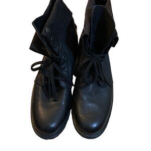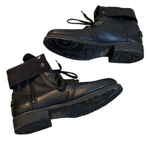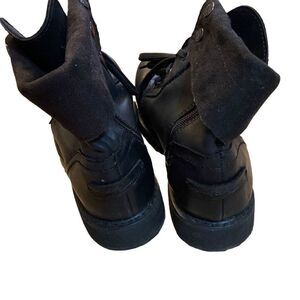 Black leather boots. Sides fold down and have snaps. Inside zips. Lace up.