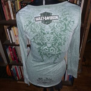 Harley-Davidson green, wings, original, fitted long sleeve tee. V-neck. No size tag, but fits like a small/medium. Approximately 18 inches from armpit to armpit, 26 inches long. From a pet and smoke free house. Happy to bundle!