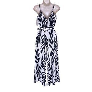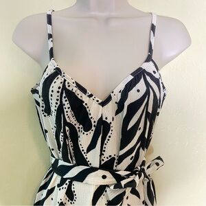 Embrace the resort vibe with this stunning Harlow & Rose black and cream jumpsuit. Featuring a sleeveless design with spaghetti straps and a v-neckline, this jumpsuit is perfect for a relaxed yet stylish look. The bold pattern and flowing silhouette make it an ideal choice for sunny getaways.