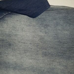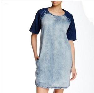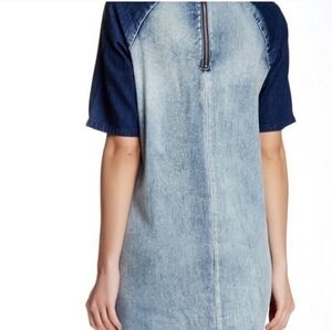 Light wash denim body with dark denim sleeves Exposed back zipper Side pockets Round neck Size Small Pit2pit 21" Length 34" Excellent condition, with no signs of wear. casual, everyday, vacation, summer, color-block, trendy, chic, girly