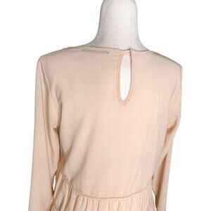 Features long sleeve top, flowy, ruffled tiered details, small cutout detailing, hi-low hem, key hole back. Color is a peachy light pink. 100% polyester.