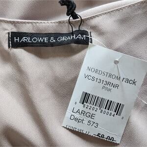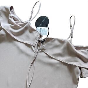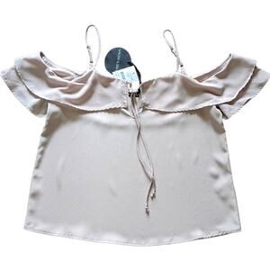 Harlowe & Graham cold shoulder top has spaghetti strips and two tiers of ruffles off the shoulder and at the top of the entire top. Muted neutral pink, size large, new with tags. Measurements in photos.