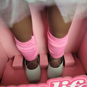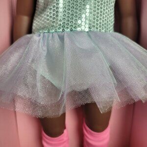 Complete in packaging with shoes, leg warmers and dance outfit featuring a tutu, sequins, and flowers along the neckline.