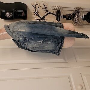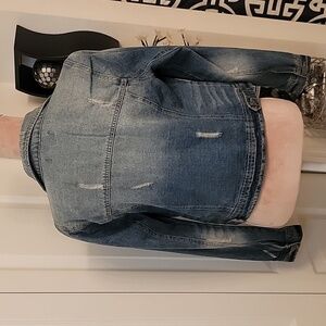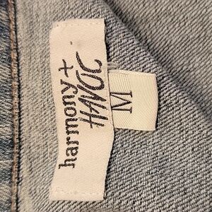 Harmony + Havoc Distressed Denim Jacket. Waist-length, 4 pockets. 65% cotton, 35% polyester. Size M. Very cute and comfy jacket.